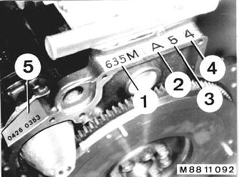 Fahrzeuge nach Modellwechsel 1982 Motor ausbauen 11 00 050. Kennzeichnung AT-Triebwerk am Kurbelgehäuse. 1 = Typenbezeichnung * * * *) 2 = "A" = Austausch/"N" = Neuteil 3 = Herstellungsmonat 4 = Herstellungsjahr (1984) Motornummer (5) einschlagen. Beiliegendes Ölmeßstab-Führungsrohr eintreiben (s.u. 11 43 101) und Motor umbauen. Motoröl * * *) auffüllen. Motorleerlauf einstellen/Abgastest 13 00 054. * * *) Siehe Service Information Gr. 00 * * * *) Siehe BMW Technik KD Information Gr.11 11 00 050 13 00 054 11 43 101 ¹) Siehe technische Daten