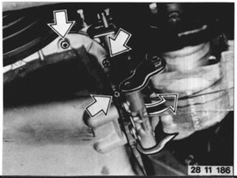 Keilriemen für Flügelpumpe abnehmen. Flügelpumpe lösen und Schrauben (4) abschrauben. Einbauhinweis: Lagerbock beim Anbau nicht verspannen - Distanzblech (5) unterlegen s. 32 41 131. Keilriemen spannen und mit Werkzeug 11 5 020 überprüfen. Siehe technische Daten