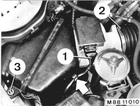 Fahrzeuge nach Modellwechsel 1982 Minuskabel abklemmen. Stecker (1) abziehen und Kabel ausheben. Schlauchschelle (2) lösen. Mutter (3) lösen und Luftfiltergehäuse mit Luftmengenmesser herausnehmen. Lüfterzarge abbauen. Einbauhinweis: Motoröl * * *) auffüllen. * * *) Siehe Service-Information Gr. 00 Siehe technische Daten