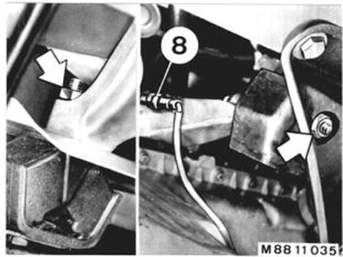 Bei Klimaanlage: Schrauben (6) und Mutter (7) lösen. Bügel nach innen herausnehmen. | ![]() |