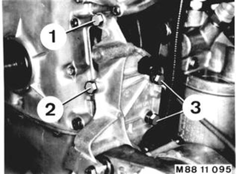 Keilriemen für Drehstromgenerator abnehmen. Drehstromgenerator lösen und zur Seite schwenken. Schraube (1) lockern. Schraube (2) abschrauben. Schrauben(3) teilweise herausdrehen. Einbauhinweis: Keilriemen spannen und mit Werkzeug 11 5 020 überprüfen. | ![]() |