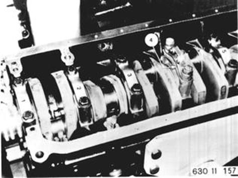 Kurbelwellenlagerdeckel abbauen. Kurbelwelle herausheben. Einbauhinweis: Lagerdeckel nicht vertauschen. Pleuel 1 ist an der Kettenradseite. Mit Lagerdeckel 4 Haltebock für Ölpumpe befestigen. | ![]() |
