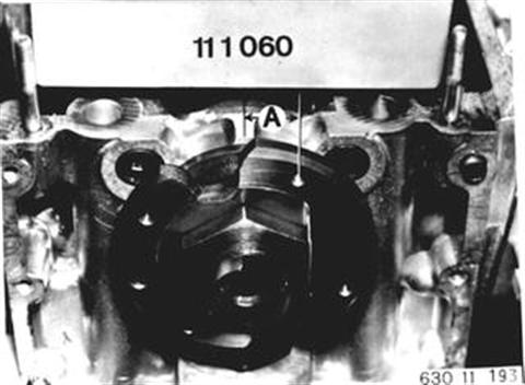 Ventilspiel aller Zylinder auf größtes Spiel einstellen. Achtung! Vor Aufbau des Druckrahmens 11 1 060, Nockenwelle von der OT-Stellung Zylinder 1 in Richtung -Einlaßseite- um ca. 15 mm (A) verdrehen. | ![]() |