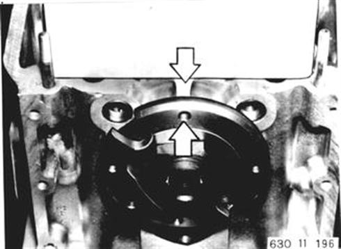 Einbauhinweis: Nach Montage des Führungsbleches muß sich die Nockenwelle leicht drehen lassen. Vor Entspannen des Druckrahmens Zylinder 6 auf Überschneidung stellen. Gewindeborhung im Flansch muß mit der Gußnase fluchten. Einbauhinweis: Ventilspiel einstellen 11 34 004. 11 34 004
