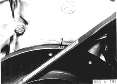 STEUERKETTE ERSETZEN Die Steuerkette ist vorgelängt. Ein Auswechseln vor 50 000 km ist nicht erforderlich. Bei abnormalen Kettengräuschen Kolben für Kettenspanner überprüfen 11 31 090. Zündverteiler ausbauen 12 11 060. Räderkastendeckel oben ausbauen 11 14 100. Kolben im Zylinder 1 auf OT stellen. OT-Markierung am Schwingungsdämpfer muß mit der Gußnase am Räderkastendeckel fluchten. 11 31 090 12 11 060 11 14 100
