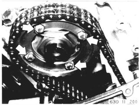 Steuerkette unten am Kettenrad abnehmen. Steuerkette vorsichtig in Fahrtrichtung nach rechts von der Gleitschiene herausschwenken. | ![]() |