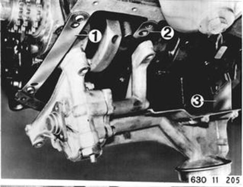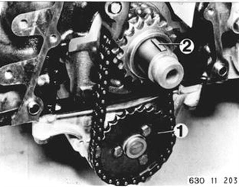 Einbauhinweis: Kettenspannung für Ölpumpenantrieb mit Ausgleichblechen (1 und 2) so einstellen, daß sich Kette mit leichtem Daumendruck eindrücken läßt. Achtung! Bei Ausgleichblechen (1) mit einer Ölbohrung Einbaulage beachten. Ölpumpe am Halteblech (3) spannungsfrei befestigen.