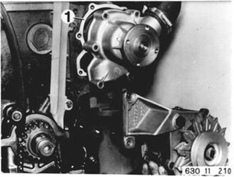 SPANNSCHIENE/GLEITSCHIENE ERSETZEN -RÄDERKASTENDECKEL ABGEBAUT- Steuerkette ausbauen 11 31 051. Wasserpumpe und Drehstromgenerator abbauen. Einbauhinweis: Dichtung (1) ersetzen. 11 31 051