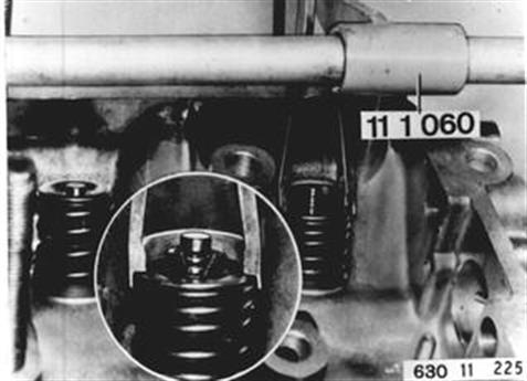 Ventilfeder mit der Vorrichtung 11 1 060 herunterdrücken und Ventilkegel ausbauen. | ![]() |