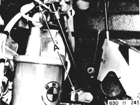 FÜHRUNGSROHR FÜR ÖLMESSTAB ERSETZEN Schelle (1) umbauen. Führungsrohr in das Kurbelgehäuse eintreiben. Abstand A 220 ± 0,5 mm unbedingt einhalten. Achtung! Bei Ölstandsmessung muß die Grifföse des Ölmeßstabes immer in Fahrtrichtung nach vorne zeigen. Nichtbeachtung führt zu Fehlmessungen. Das heißt, die Motorölfüllmenge¹) entspricht nicht der Vorschrift. ¹) Siehe technische Daten