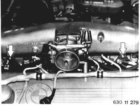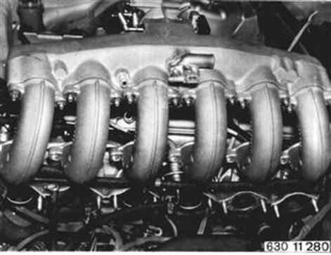 Halter (10) für Zusatzluftschieber und alle Saugrohre von den Ansaugstutzen abbauen. Einbauhinweis: Scheiben hinter dem Halter beilegen. | ![]() |