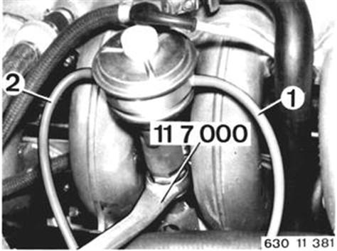AGR-VENTIL ERSETZEN Prüfung siehe 11 70 009. Unterdruckschläuche (1 und 2) abziehen. Einbauhinweis: Schläuche farbengleich aufstecken. Überwurfmutter mit Schlüssel 11 7 000 lösen. 11 70 009