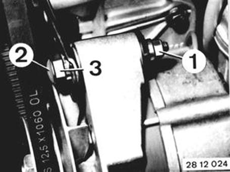 Keilriemen spannen: Mutter (1) lösen und Spannrad (3) mit einem Drehmoment von ca. 7 Nm verdrehen. Mutter (1) festziehen. Spannung mit Prüfgerät nochmals prüfen, ggf. korrigieren.