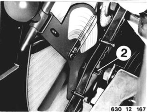 Keilriemenspannung prüfen: Prüfgerät 11 5 020 anlegen. Der Zughaken (2) muß dabei in der Mitte der Verzahnung aufliegen. Der Meßzeiger muß sich auf der Skala über dem grünen, bzw. gelben Feld befinden.