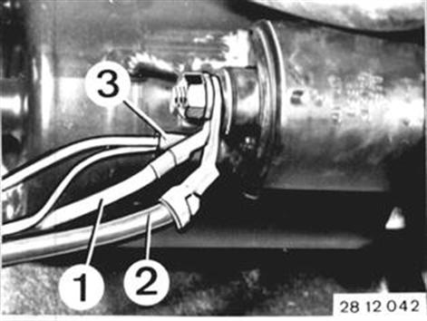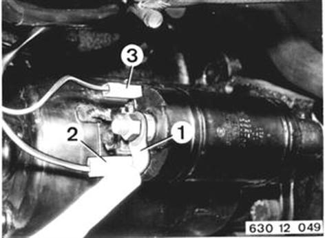 Minusklemme von der Batterie abschrauben. Leitungen (1 und 2) abschrauben, Stecker (3) abziehen. Bei Anlasserersatz: Abdeckung für Magnetschalter abnehmen und am neuen Anlasser mit Kabelbänder (275 mm Länge) anbringen. | ![]() |