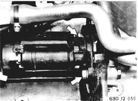 Befestigungsschrauben herausdrehen und Anlasser abnehmen. Um die Zugänglichkeit zu verbessern, kann bei der oberen Schraube ein nachträglich gebogener Ringschlüssel verwendet werden. | ![]() |