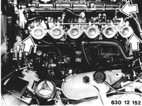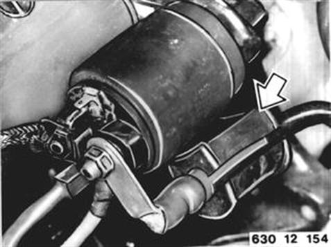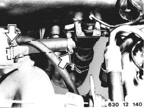 Fahrzeuge nach Modellwechsel 1982 Modelle 628 CSi / 635 CSi Schlauch zum Heizventil abbauen. Kühlmittel ablassen. Einbauhinweis: Kühlmittel *) auffüllen, Kühlsystem entlüften - siehe Pos. 17 00 039. *) Siehe Service-Information Gr. 00 17 00 039 Siehe technische Daten