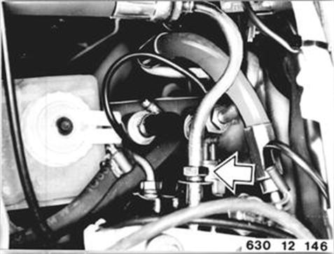 Bremspedal ca. 20 mal betätigen, um den Speicherdruck abzubauen. Leitung für Hydrolenkung abschrauben. | ![]() |