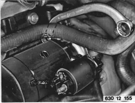 Kabelbänder trennen und Abdeckung für Magnetschalter abnehmen. Leitungen abschrauben und abziehen. Einbauhinweis: Auf richtige Einbaulage des Isolierstückes für B + Leitung achten. | ![]() |