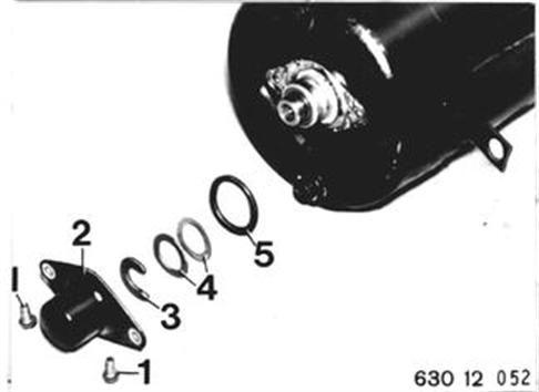 ANLASSER ZERLEGEN UND ZUSAMMENBAUEN -ANLASSER AUSGEBAUT- Magnetschalter ausbauen 12 41 511. Befestigungsschrauben (1) herausdrehen. Staubkappe (2) abnehmen. Sicherungsscheibe (3), Ausgleichscheiben (4) und Dichtung (5) abnehmen. Einbauhinweis: Ankerachsialspiel mit den Scheiben (4) auf 0,10 ... 0,15 mm ausgleichen. 12 41 511
