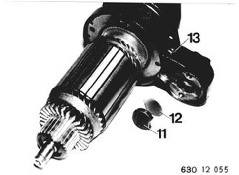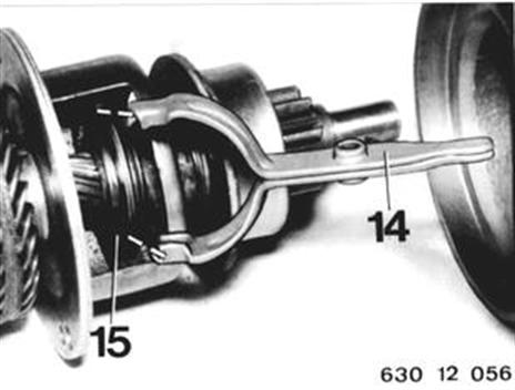 Anker aus Antriebslager ziehen. Einrückhebel (14) herausnehmen. Einbauhinweis: Einrückhebel (14) so einbauen, daß der Einrückring (15) zwischen die Nasen des Einrückhebels kommt. Einrückhebel mit Siliconfett Bosch FT 2 v 3 fetten. | ![]() |