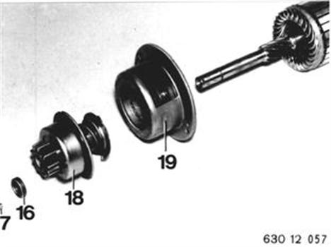 Anlaufring (16) nach hinten drücken. Sicherungsring (17) ausheben. Anlassergetriebe (18) und Lagerschild (19) abziehen. Einbauhinweis: Steilgewinde, Einrückring und Zwischenlager mit Siliconfett Bosch Ft 2 v 3 bestreichen. Anlaufring (16) über den Sicherungsring (17) ziehen. | ![]() |