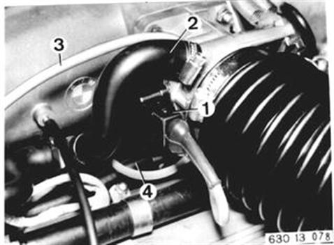 DROSSELKLAPPENSTUTZEN AUS- UND EINBAUEN Ausführung mit Zugfeder: Luftfilter ausbauen 13 71 000. Faltenbalg vom Drosselklappenstutzen abbauen. Stecker (1) vom Drosselklappenschalter abziehen. Achtung! Nicht an den Kabeln ziehen. Schlauch (2) zum Unterdruckbegrenzer und Schlauch (3) - rot - zum elektr. Magnetventil vom Drosselklappenstutzen lösen. Vorwärmschlauch (4) abbauen.  13 71 000 |  |