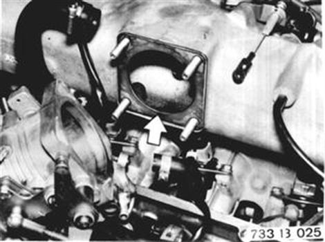 a) Zylinderkopfhaube ausbauen 11 12 000 oder b) Stehbolzen unten links herausdrehen. Einbauhinweis: Zum schnelleren Einbau einen Schlitz in den Stehbolzen einsägen und mit Schraubenzieher eindrehen. Drosselklappenstutzen vom Sammler abbauen. Einbauhinweis: Dichtung erneuern. Leerlauf einstellen 13 00 054.  11 12 000  13 00 054 |  |