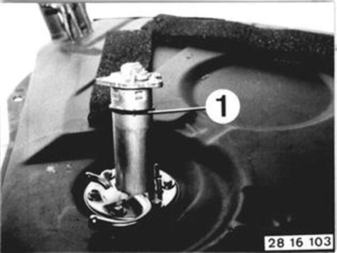 Fahrzeuge nach Modellwechsel 1982 Bei Modellen mit eingebauter Vorförderpumpe: Deckel vom Gepäckraumboden abschrauben. Muttern lösen und Anschlußstecker abziehen.