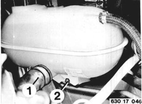 Fahrzeuge nach Modellwechsel 1982 Verschluß abschrauben. Schlauch (1) abbauen und Kühlmittel ablasssen. Schraube (2) herausdrehen. | ![]() |