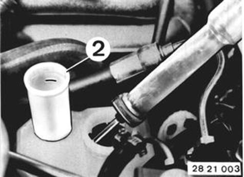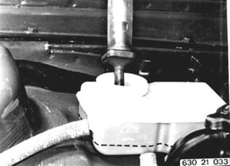Verschraubung am Ausgleichbehälter abschrauben. Schwimmerbehälter (2) herausnehmen. Bremsflüssigkeit im Ausgleichbehälter bis zum Anschluß der Nachfülleitung absaugen. | ![]() |