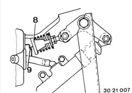 Achtung! Einbauhinweis: Vor Anbau der Kolbenstange (3) Übertotpunktfeder (8) in die Führungsnase (9) am Fußhebelwerk einrasten. | ![]() |