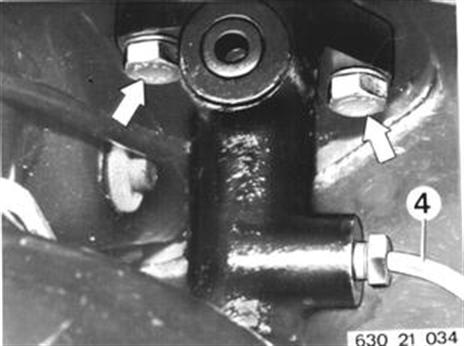 Nachfülleitung herausziehen. Leitung (4) zum Nehmerzylinder abbauen. Geberzylinder von Motortrennwand lösen und nach vorne herausnehmen. Einbauhinweis: Kupplungshydraulik entlüften 21 00 006. 21 00 006