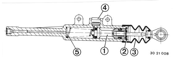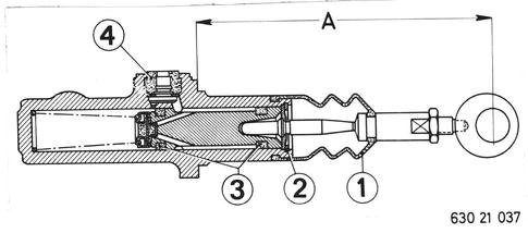 KUPPLUNGSGEBERZYLINDER ÜBERHOLEN (AUSGEBAUT) Geberzylinder und Innenteile mit Spiritus reinigen. Bei Riefen oder Korrosionsstellen in der Zylinderbohrung. Geberzylinder kpl. ersetzen. Reparatursatz einbauen. Bestehend aus: 1 Schutzkappe 2 Sicherungsring 3 Nutringe 4 Dichtstopfen 5 Scheibe Einstellmaß A 140 ± 0,5 mm