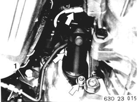 Halterung (1) am Getriebe lösen. Kupplungsnehmerzylinder abbauen. Leitung bleibt angeschlossen. Einbauhinweis: Entlüfterschraube zeigt nach unten. Kabel für Rückfahrscheinwerfer abziehen. |  |