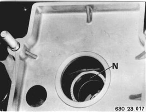Einbauhinweis: Mit dem Kupplungsnehmerzylinder Ausrückhebel in Einbaulage bringen. Kupplungsdrucklager ausrichten. Schmiernut (N) mit Molykote BR 2-750 füllen. Bei Nichtbeachtung kann das Drucklager auf der Führungshülse fressen. Vor Anbau des Getriebes Gang einlegen. Führungshülse des Getriebes vorsichtig in das Drucklager einführen. Abtriebsflansch solange drehen, bis die Antriebswelle in dei Mitnehmerscheibe gleitet. Kupplungsnehmerzylinder wieder ausbauen. Getriebe befestigen. |  |