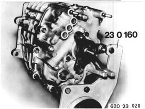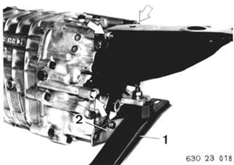 GETRIEBEGEHÄUSE-VORDERTEIL AB- UND ANBAUEN/ABDICHTEN Getriebe ausbauen 23 00 020. Konsole abbauen. Einbauhinweis: Lagerböcke überprüfen ggf. ersetzen. Querträger (1) und Auspuffträger (2) abbauen. 23 00 020