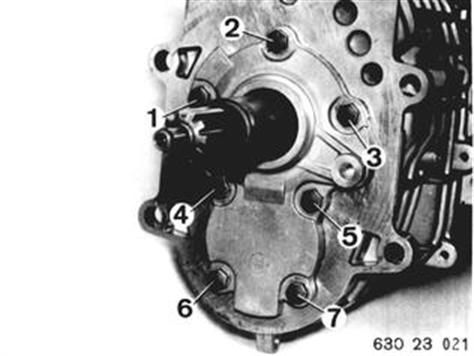 Deckel abbauen. Achtung! Ausgleichscheiben. Einbauhinweis: Dichtung ersetzen. Schrauben mit Dichtmasse einsetzen. Achtung! Schraubenlänge beachten. Schrauben (1 ... 3) 8 x 30 mm Schrauben (4 ... 7) 8 x 22 mm | ![]() |