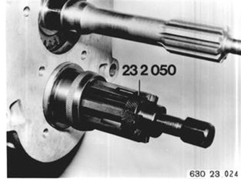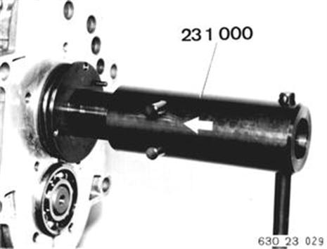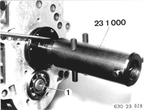 Rillenkugellagerinnenring auf ca. 80°C erwärmen und auf Vorlegewelle (1) aufziehen. Rillenkugellagerinnenring auf ca. 80°C erwärmen und mit Vorrichtung 23 1 000 auf Antriebswelle bis zum Festsitz aufdrücken. | ![]() |