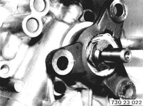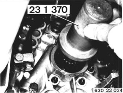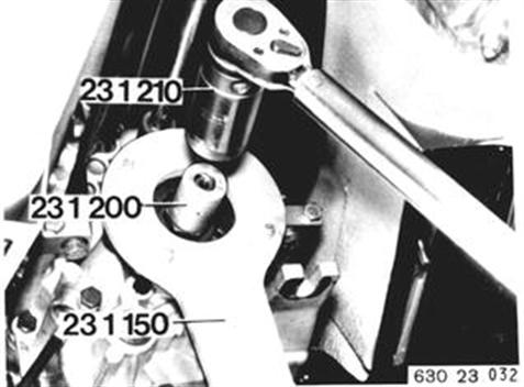 Führungsbüchse 23 1 200 aufstecken. Abtriebsflansch mit Halteschlüssel 23 1 150 gegenhalten. Mit Steckschlüssel-Einsatz 23 1 210 Bundmutter lösen. | ![]() |