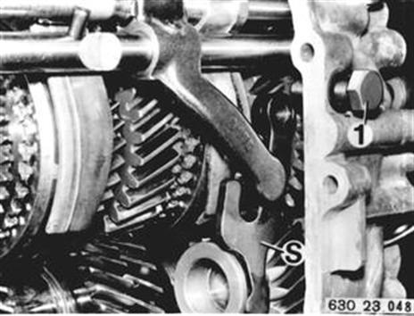 AN- UND ABTRIEBSWELLE KPL. AUS- UND EINBAUEN -GETRIEBEGEHÄUSE-VORDERTEIL ABGEBAUT- Schraube (1) so weit herausdrehen bis Schalthebel (S) für Rückwärtsgang herausgenommen werden kann. | ![]() |