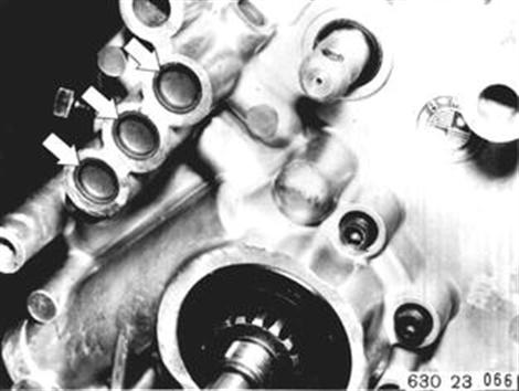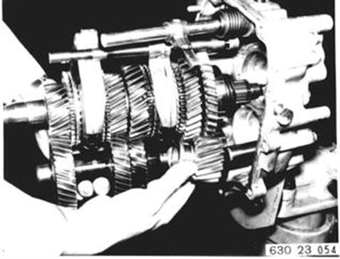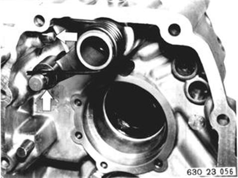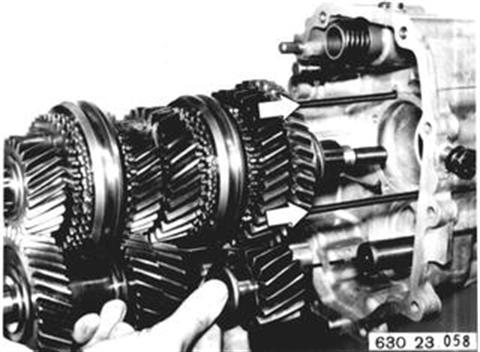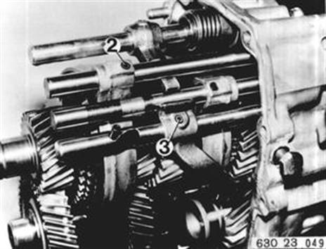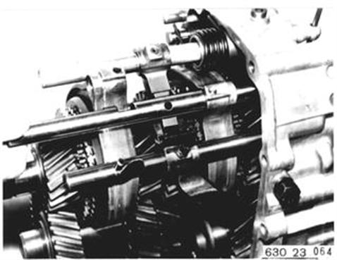 Schaltwelle einbauen. Achtung! Rollen. Schaltgabeln aufstecken, hohe Schaltgabel 3./4. Gang. Arretierkugeln einlegen. Schaltstange Rückwärtsgang einbauen. | ![]() |