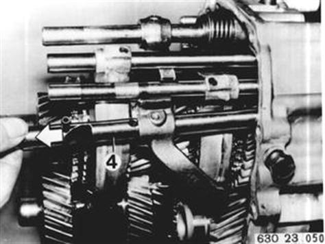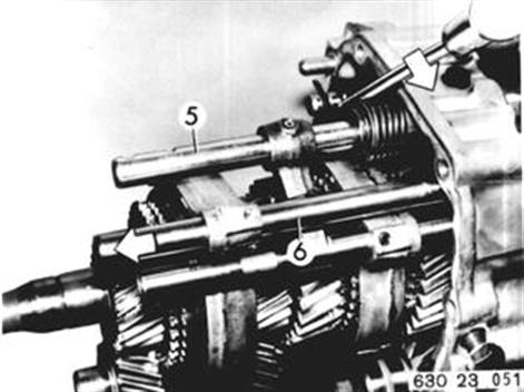 Schaltwelle (5) so weit verdrehen bis Schaltstange 3./4. Gang (6) herausgezogen werden kann. Achtung! Freiwerdende Kugeln. | ![]() |