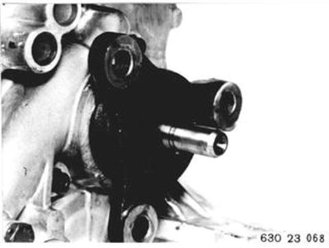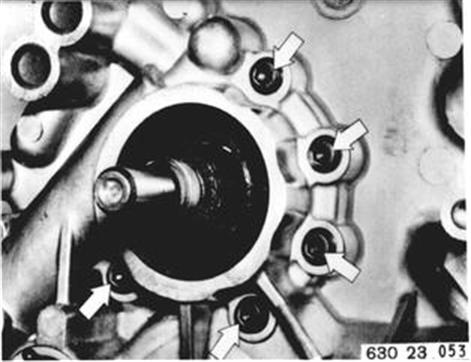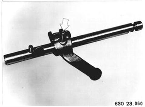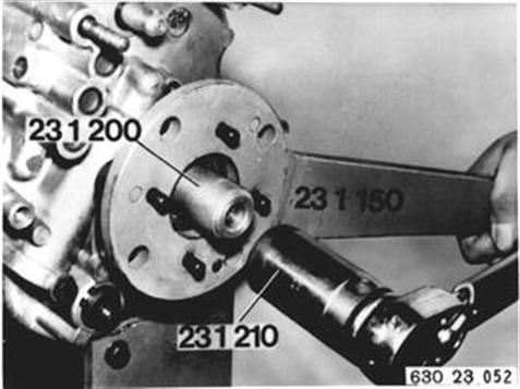 Sicherungsblech ausheben. Führungsbuchse 23 1 200 aufstecken. Abtriebsflansch mit Halteschlüssel 23 1 150 gegenhalten. Mit Steckschlüssel Einsatz 23 1 210 Bundmutter lösen. | ![]() |
