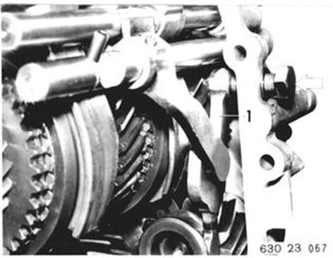 Schalthebel (1) für Rückwärtsgang einbauen und Schraube festziehen. Achtung! Schalthebel nicht schief ansetzen. Zwischen Schalthebel und Getriebedeckel muß Spiel sein. | ![]() |