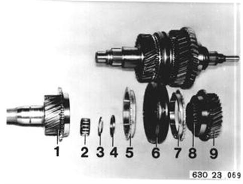 ABTRIEBSWELLE ZERLEGEN UND ZUSAMMENBAUEN -ABTRIEBSWELLE AUSGEBAUT- Antriebswelle (1), Nadelkäfig (2), Sicherung (3), Stützscheibe (4), Synchronring (5), Synchronkörper mit Schiebemuffe (6), Synchronring (7), Nadelkäfig (8) und Gangrad 3. Gang (9) abnehmen. Achtung! Synchronringe zu den jeweiligen Gangrädern zeichnen. | ![]() |