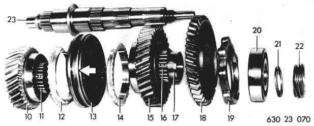 Gangrad 2. Gang (10), Nadelkäfig (11), Synchronring (12), Synchronkörper mit Schiebemuffe (13), Synchronring (14), Gangrad 1. Gang (15), Nadelkäfig (16), Distanzbüchse (17), Rückwärtsgangrad (18), Abstützring (19), Rillenkugellager (20), Stützscheibe (21) und Tachorad (22) von der Abtriebswelle (23) abpressen. Achtung! Synchronringe zu den jeweiligen Gangrädern zeichnen. Die abgesetzte Seite der Schiebemuffe (13) muß zum 1. Gang zeigen. Nichtbeachtung kann zu starken Geräuschen führen. Einbauhinweis: Synchroneinrichtungen überprüfen 23 23 503. 23 23 503