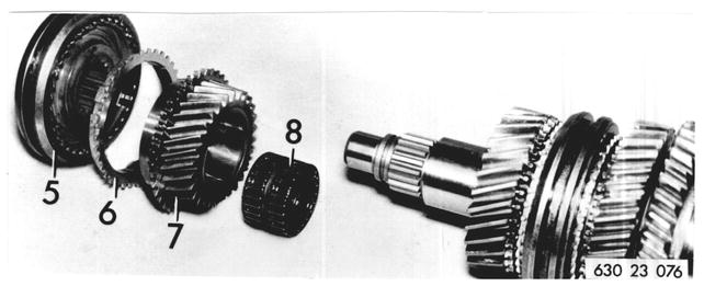 Synchronkörper mit Schiebemuffe (5), Synchronring (6), Gangrad 3. Gang (7) und Nadelkäfig (8) abziehen. Achtung! Synchronring zum Gangrad zeichnen. Synchroneinrichtung prüfen 23 23 503. 23 23 503