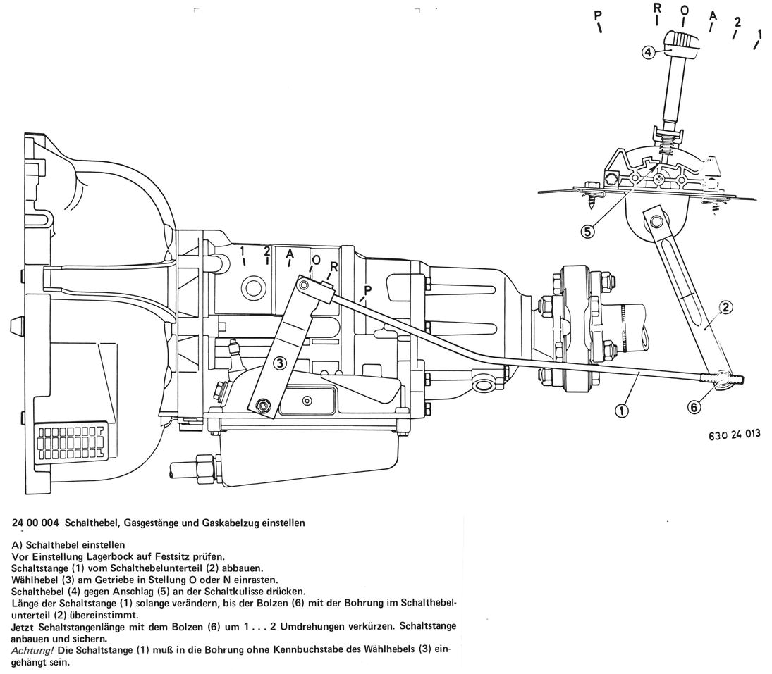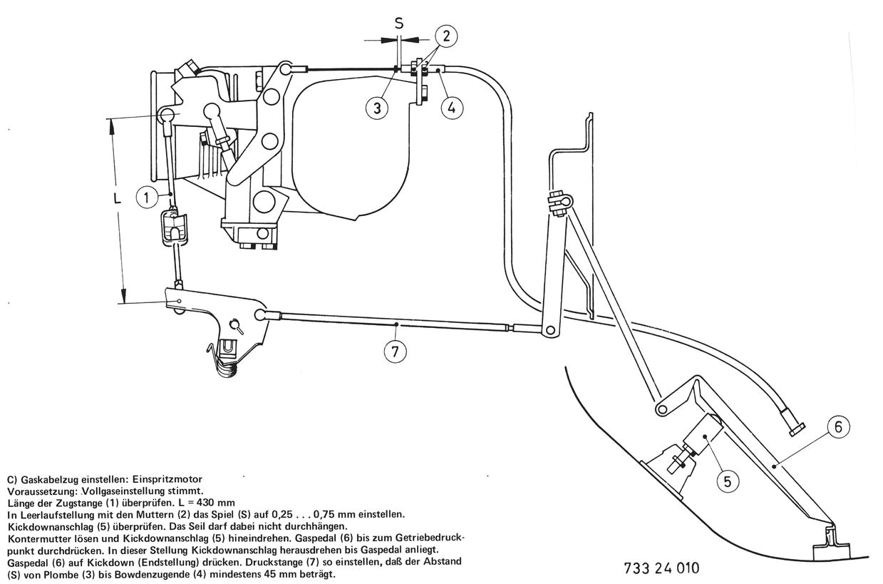 B) Gaskabelzug einstellen. Vergasermotor (Ausführung mit Zugelement) Voraussetzung: Vollgaseinstellung stimmt. Länge der Zugstange (1) überprüfen. Vergasermotor L = 275 mm. Zusätzlich bei Vergasermotor Zugelement (2) überprüfen. L = 140 mm. Bei laufendem Motor im Leerlauf (Drosselklappenanheber angezogen) mit der Schraube (3) das Spiel (S) auf 0,25 ... 0,75 mm einstellen. Das Seil darf dabei nicht durchhängen. Fahrfußhebel (4) gegen Anschlag (5) drücken. Druckstange (6) so einstellen, daß der Abstand (S) vom Plombe (7) bis Bowdenzugende (8) mindestens 45 mm beträgt.