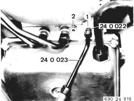Fahrzeuge vor Modellwechsel 1982  HYDRAULISCHE DRUCKWERTE ÜBERPRÜFEN Manometer 13 3 061 in Verbindung mit Schlauch 24 0 021 an Frontklappe befestigen. Zur Prüfung kann auch das Prüfgerät 24 0 000 verwendet werden. | ||||||||||